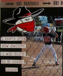 I decided to focus on team colors for this layout, which made it fairly simple to put together. The photos basically tell the story. The team doesn't do rookie cards, so my daughter put one together. It is perfect! I downloaded and printed the Bandits logo and cut the title and event logo from the schedule info sheet. Baseball words came from two sheets of scrapbook paper by Scrappin' Sports. Then, I added some fun words from - can you believe it - coffee themed paper from Photo Play.